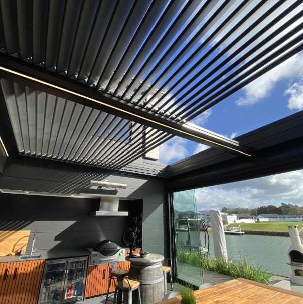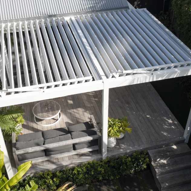 Retractable & Folding Louvre Roofs: The louvres can be fully retracted to open up to 75% of the roof area, or pivot to control light, airflow, and privacy, adapting effortlessly to changing weather conditions.